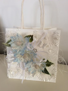 for this blog hop I have decorated a plain white paper bag with Lace and a few gems and I have used